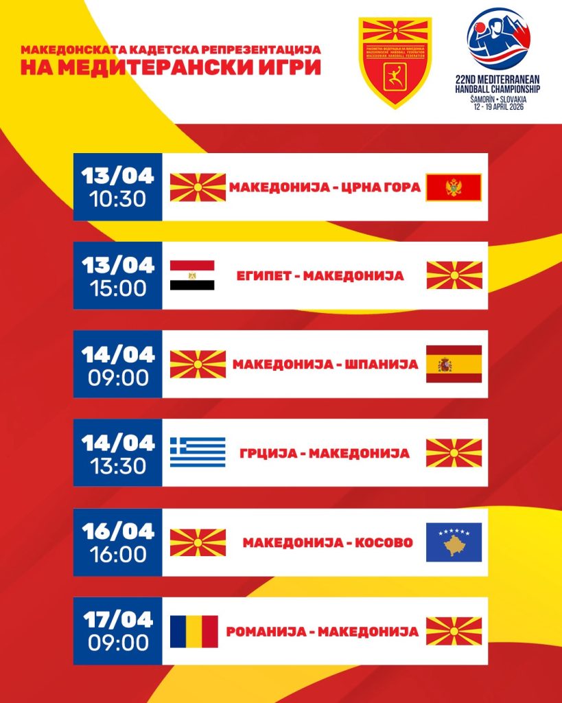 Кадетската машка репрезентација на Македонија во периодот од 12 до 19 април ќе учествува на Медитеранските игри во Словачка.