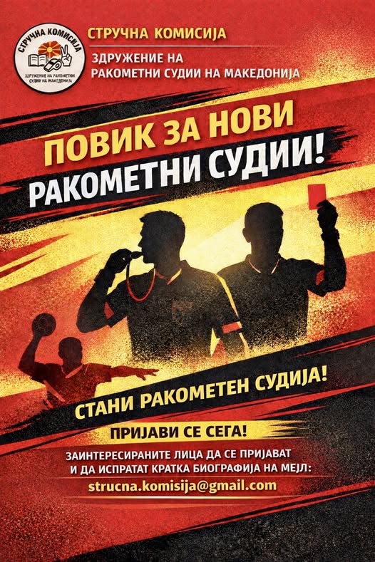 Здружението на ракометни судии на Македонија, преку Стручната комисија, објавува повик за пријавување на нови ракометни судии.